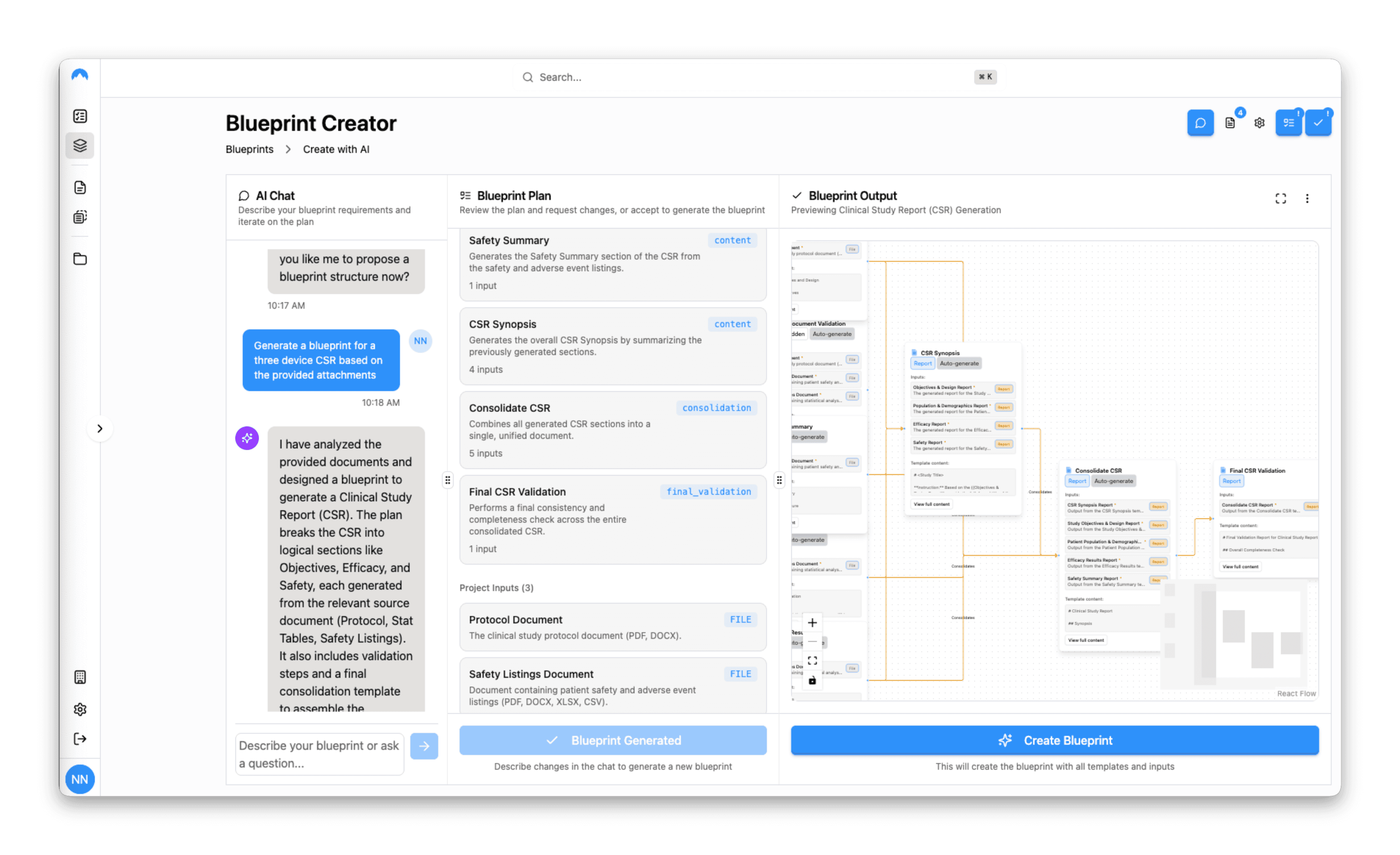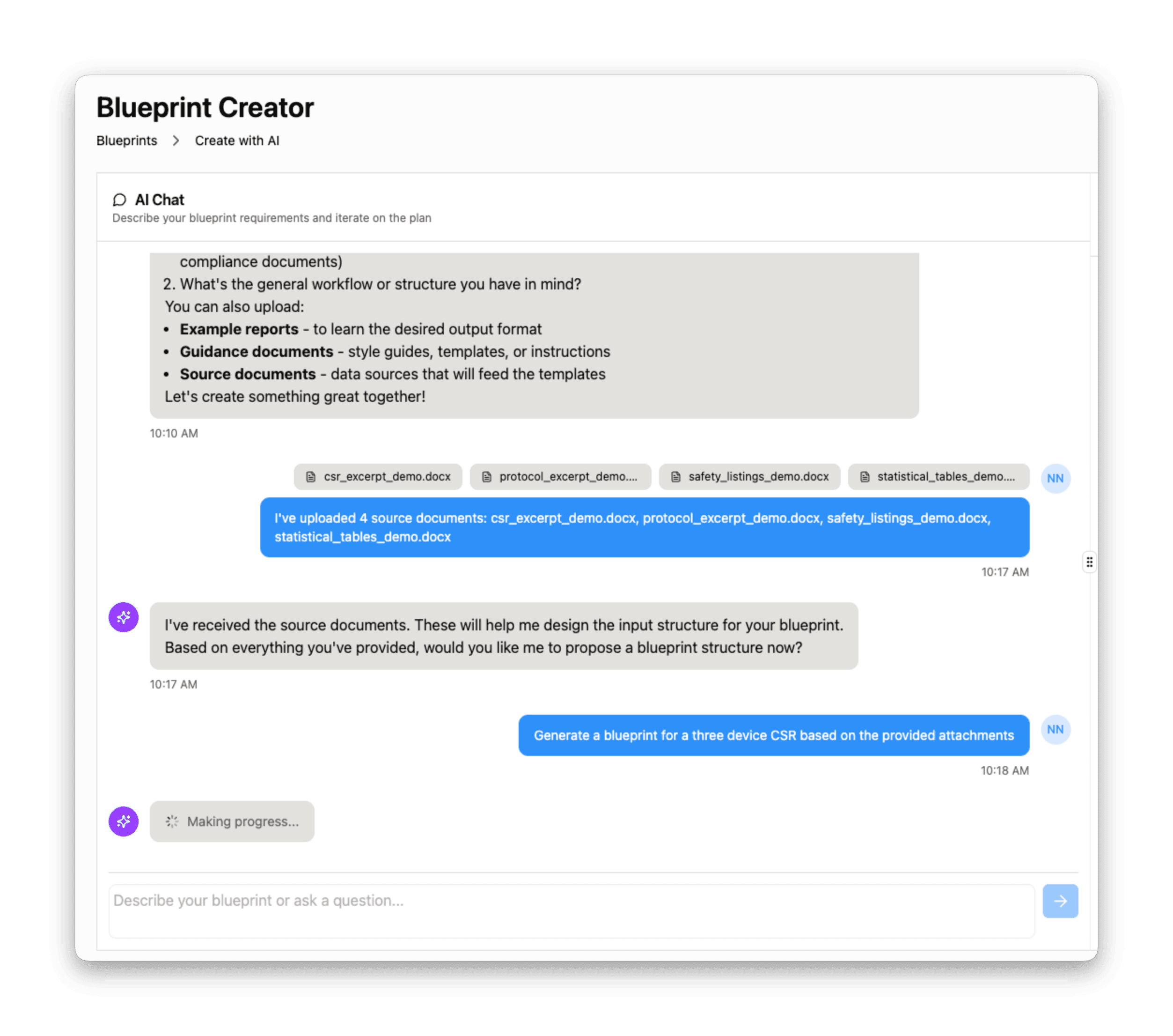 Teams upload their source documents and describe their goal in natural language. The Blueprint Creator takes it from there.