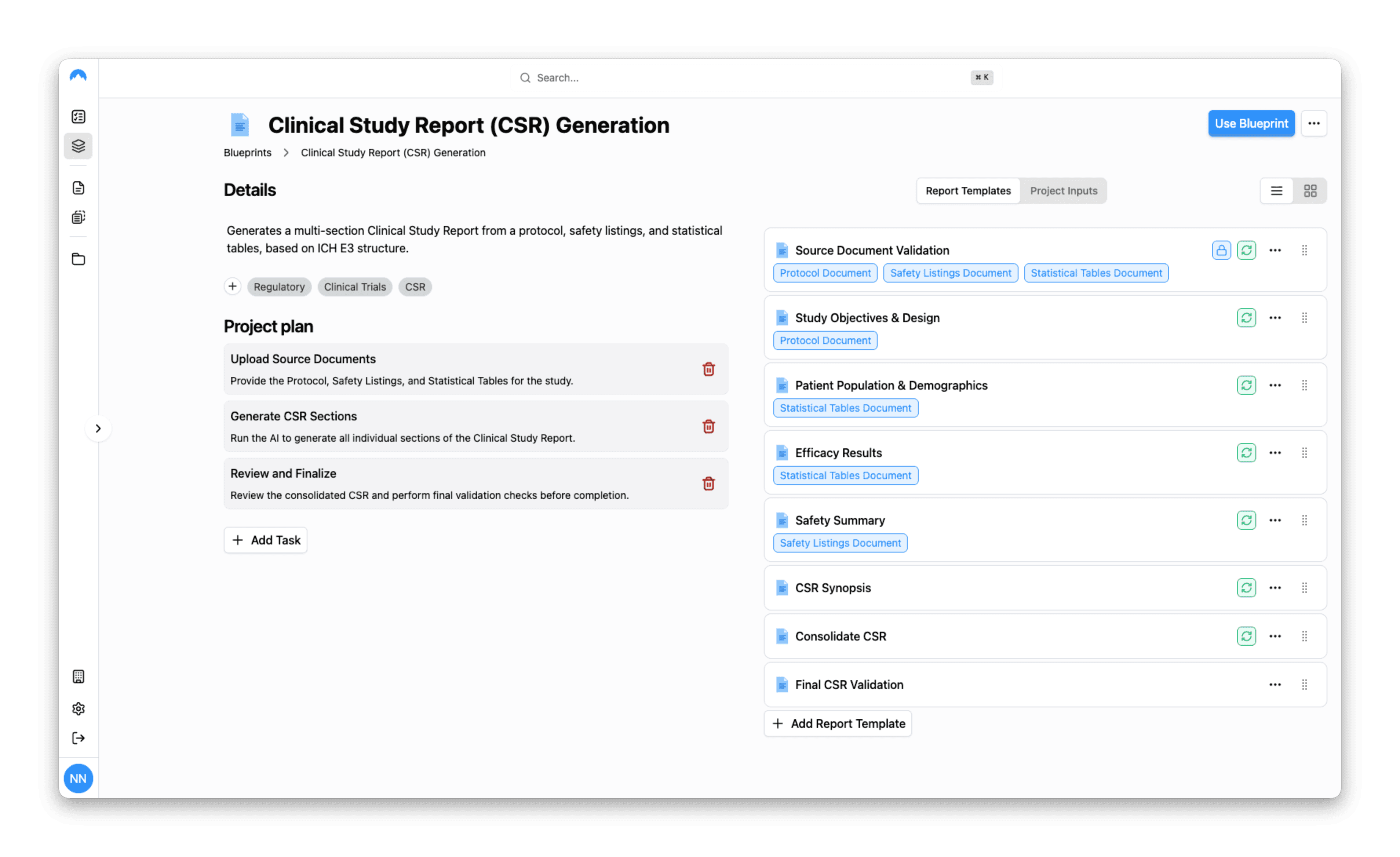 The finished Blueprint: a reusable workflow with report templates, project inputs, and a step-by-step project plan that any team member can run.