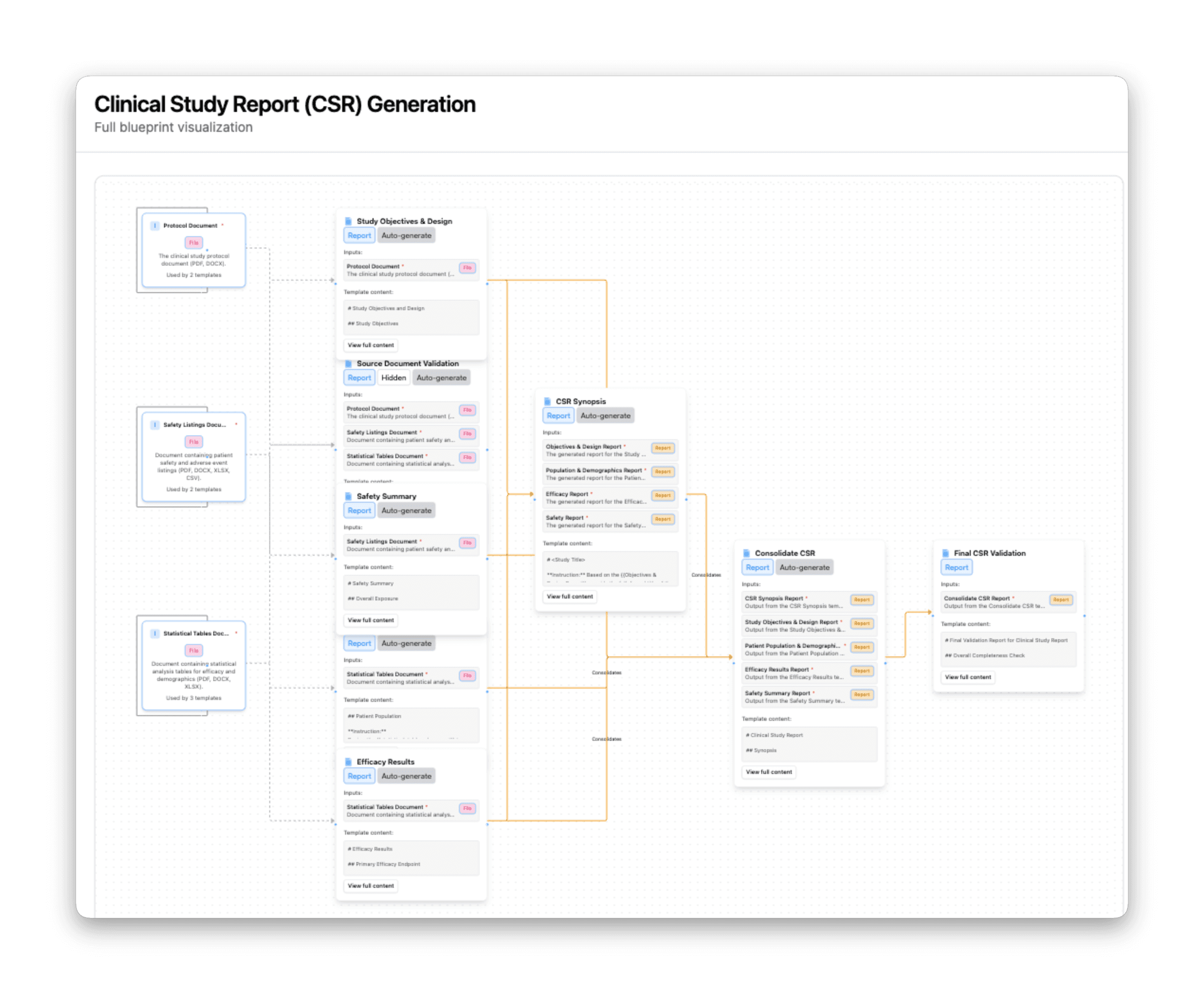 The generated Blueprint: a complete workflow showing how source documents flow through individual report sections, consolidation, and final validation.