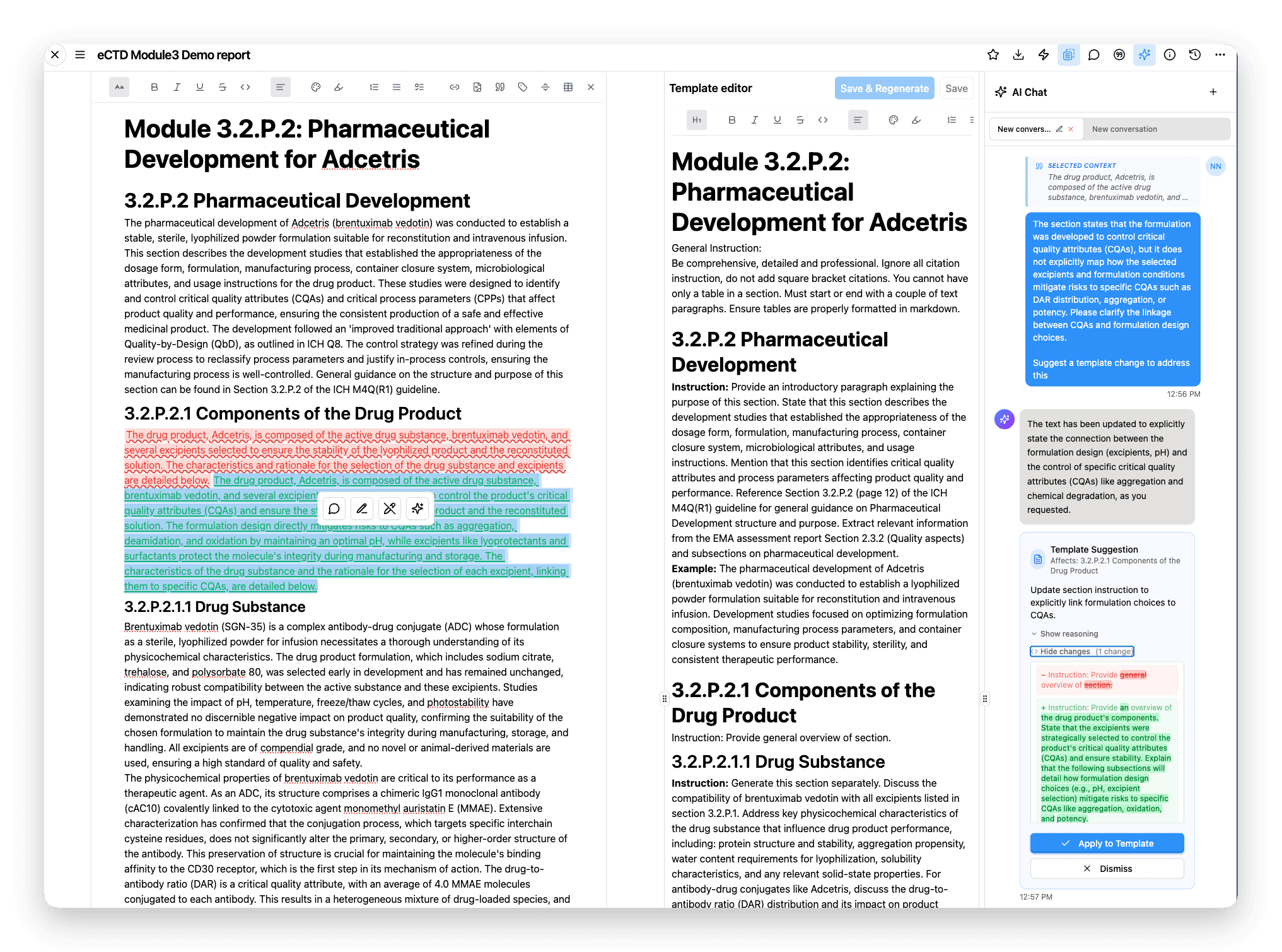 Every suggestion appears as tracked change in the chat sidebar, showing exactly what would change — a safety section updated to reflect revised regulatory guidance, a manufacturing step reordered, a heading adjusted. Authors can apply or dismiss each one individually — nothing is updated without explicit approval. The reasoning behind each change stays visible, so teams build a record of how the template evolved and why.