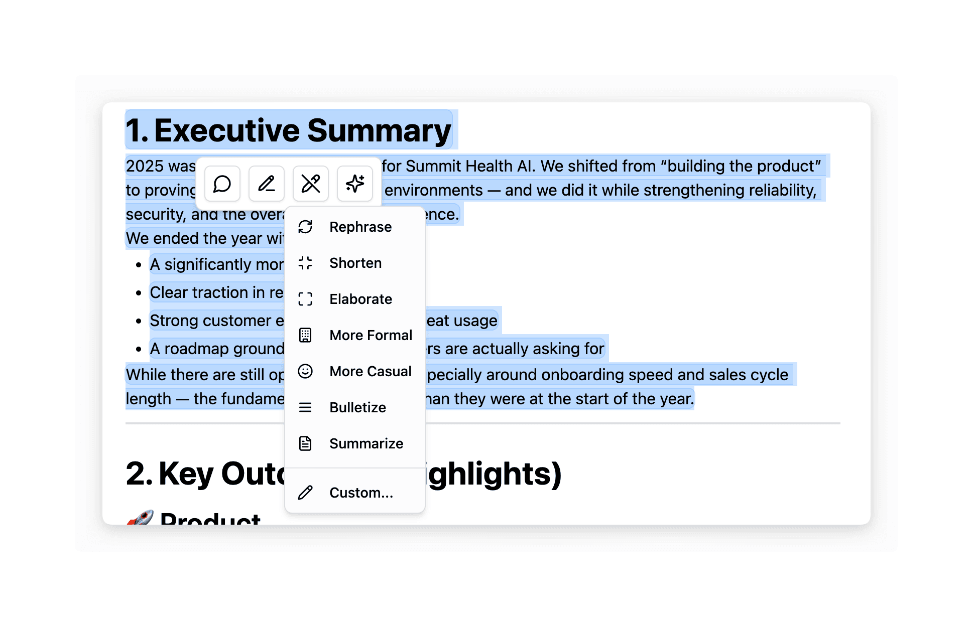 Generating a first draft is only the beginning. In real workflows, the next steps, tightening language, expanding key sections, and aligning tone to internal standards, are where quality is refined and consistency is ensured. These adjustments often require multiple editing cycles, making revision one of the most time-consuming stages of document production.