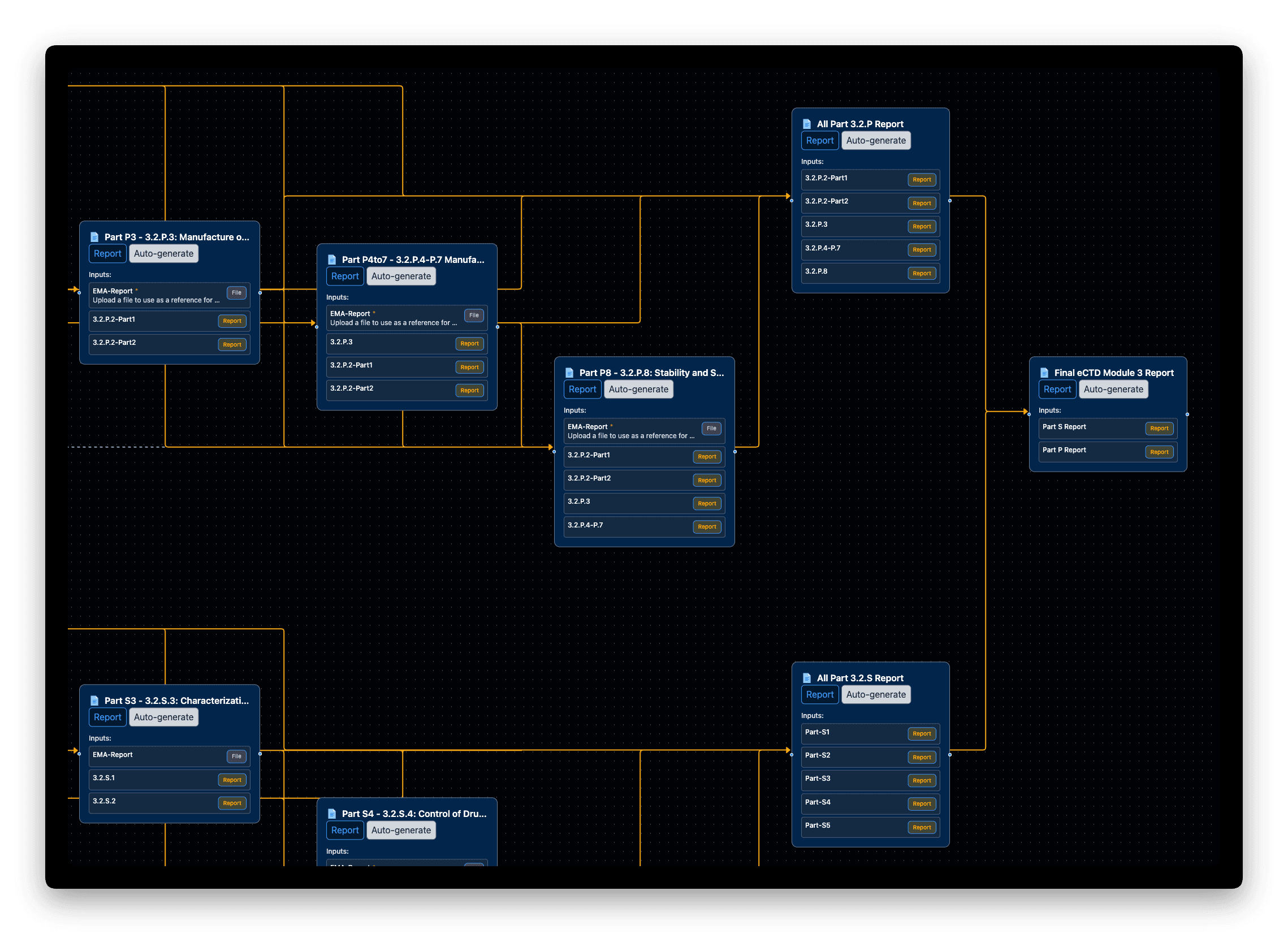 Blueprint Workflow Visualization for an eCTD Module 3 report illustrating how intermediate reports, generation steps, and final submission outputs connect in a single transparent workflow.